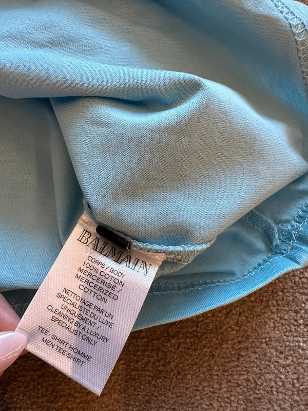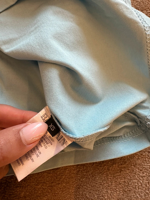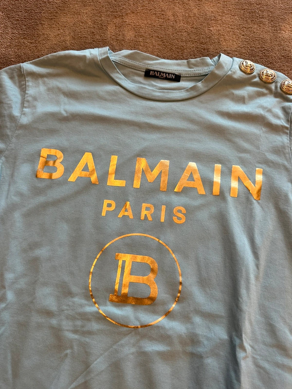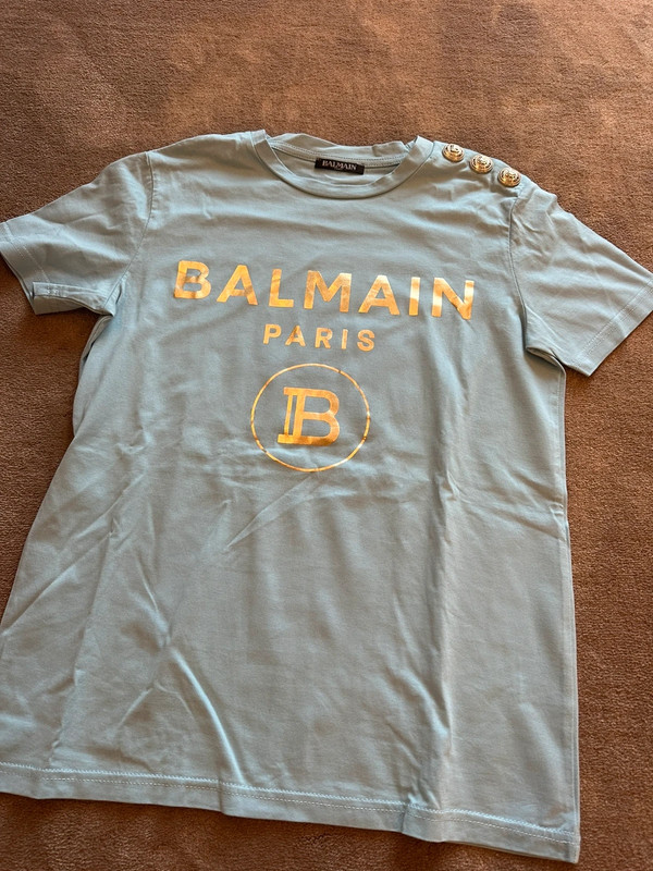Balmain T-shirt, size XS, blue with golden letters and buttons, never worn