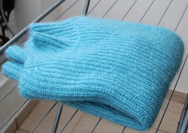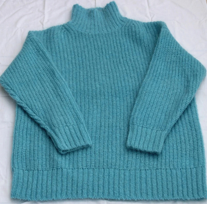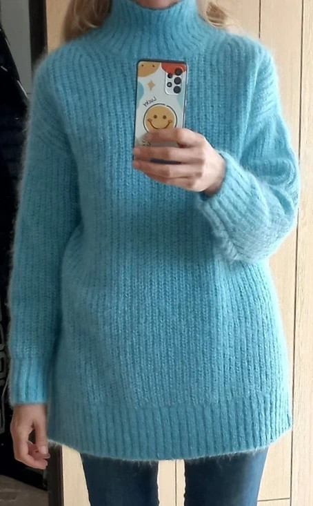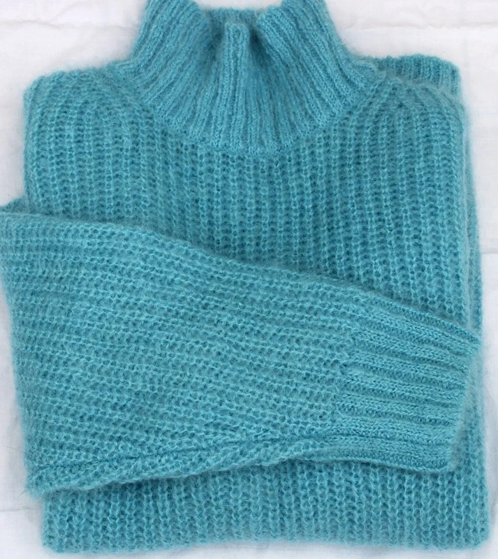 Sweater has a beautiful turquoise color. High-quality handmade sweater for cold days.