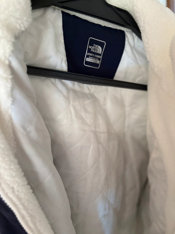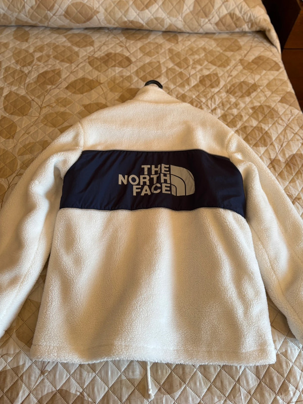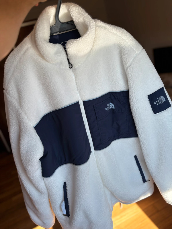 Denali Sherpa style model, in wool/furry fur. White color with blue details. Super comfortable, warm, and with the brand’s iconic design. Excellent for cold days, easily matches casual or outdoor looks.