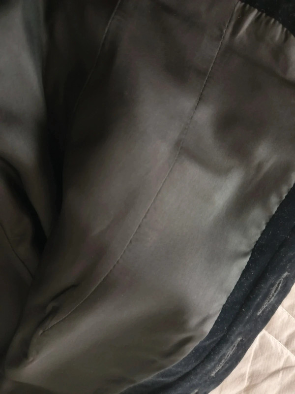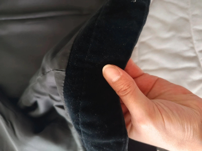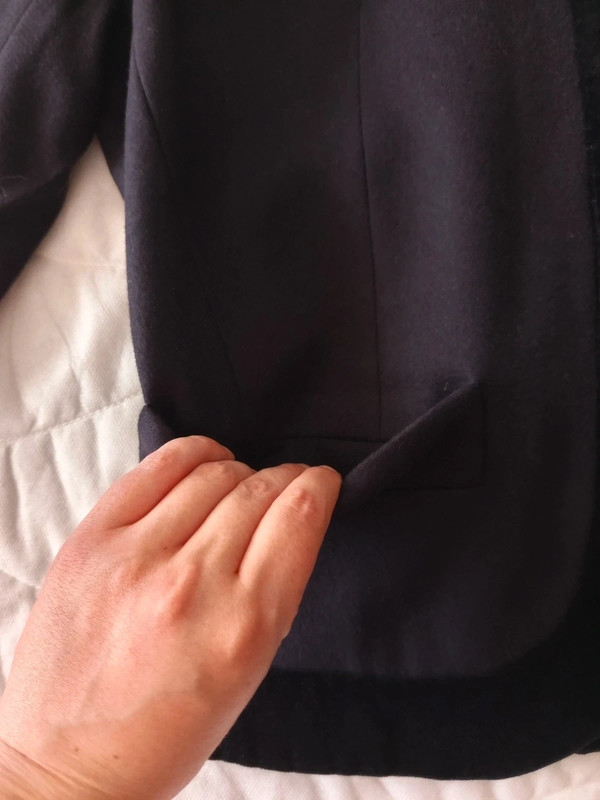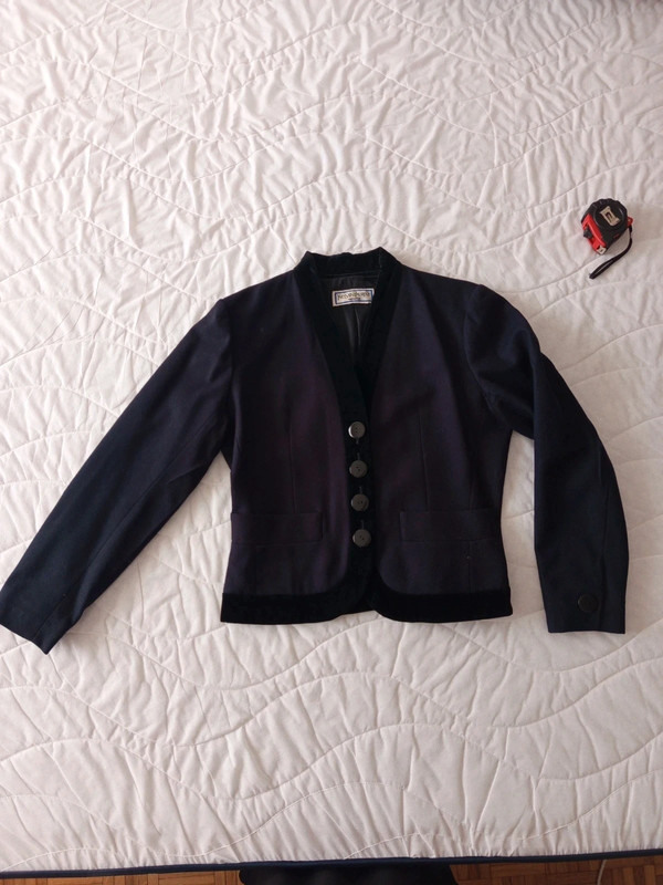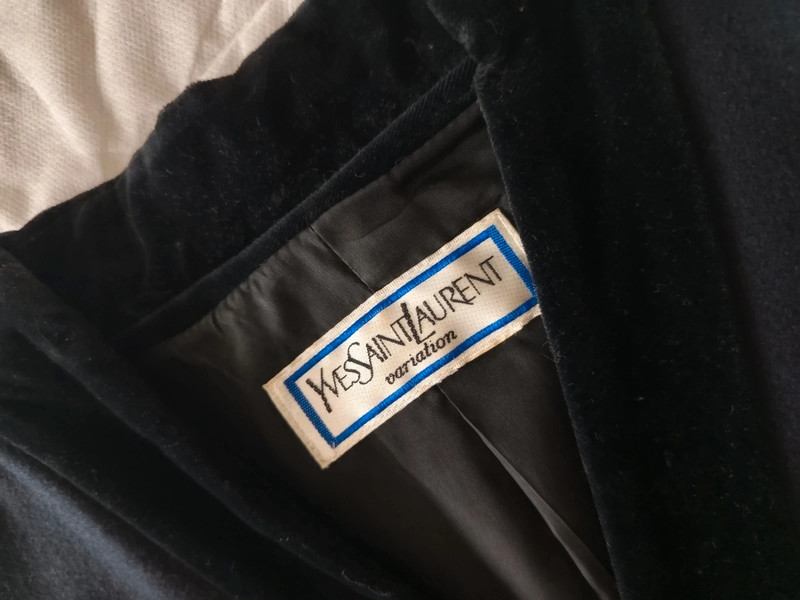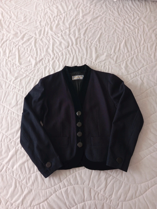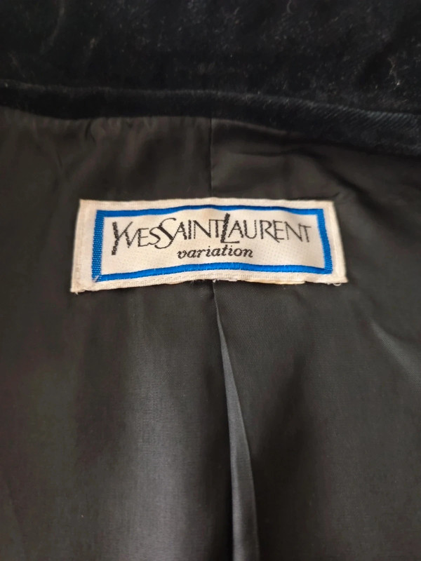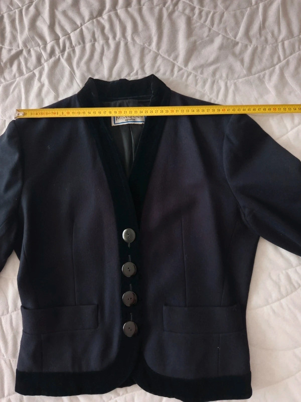Темно-синій піджак / куртка з чистої вовни з чорним велюром на лацкані та комірі від Yves Saint Laurent колекції Variations. 90-ті роки. 4 товсті ґудзики спереду, і два на манжетах. Легко приталений. Кишені спереду. У відмінному стані. Розмір 42.