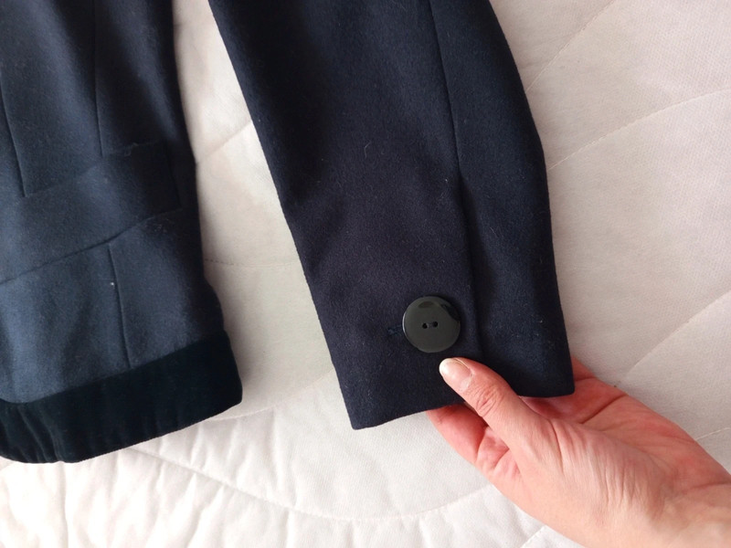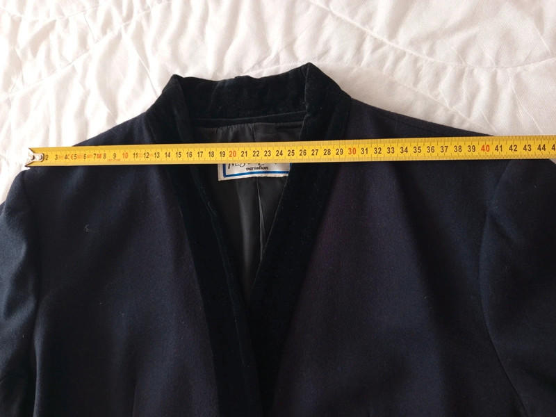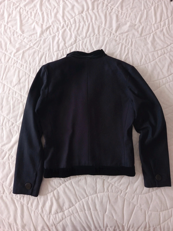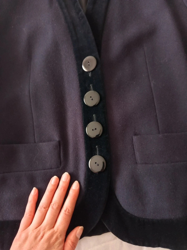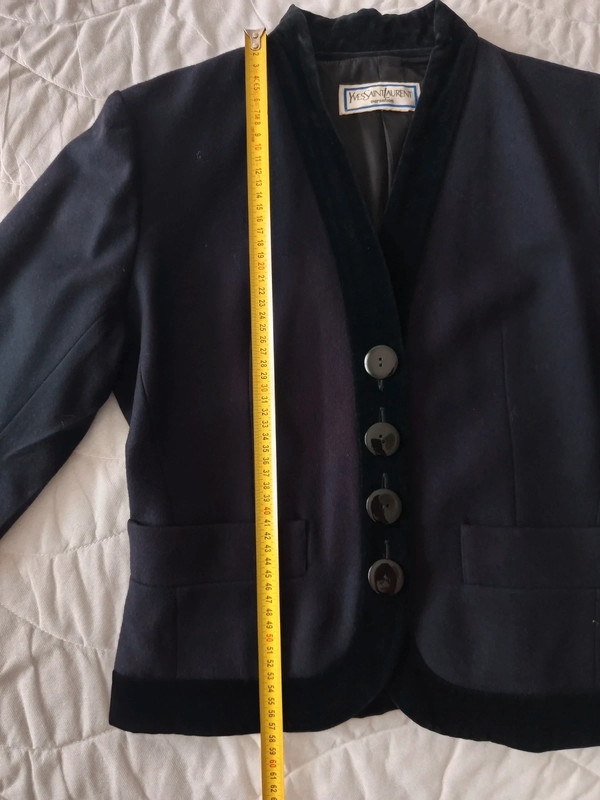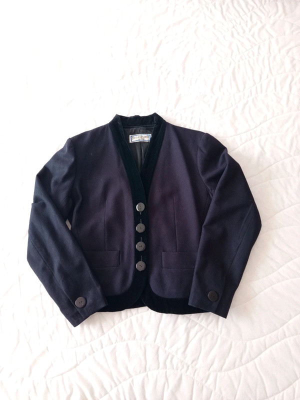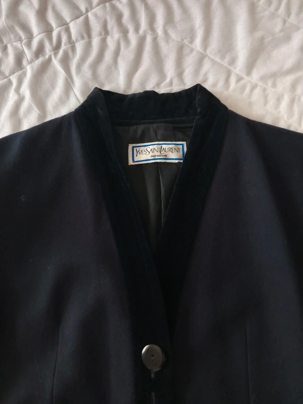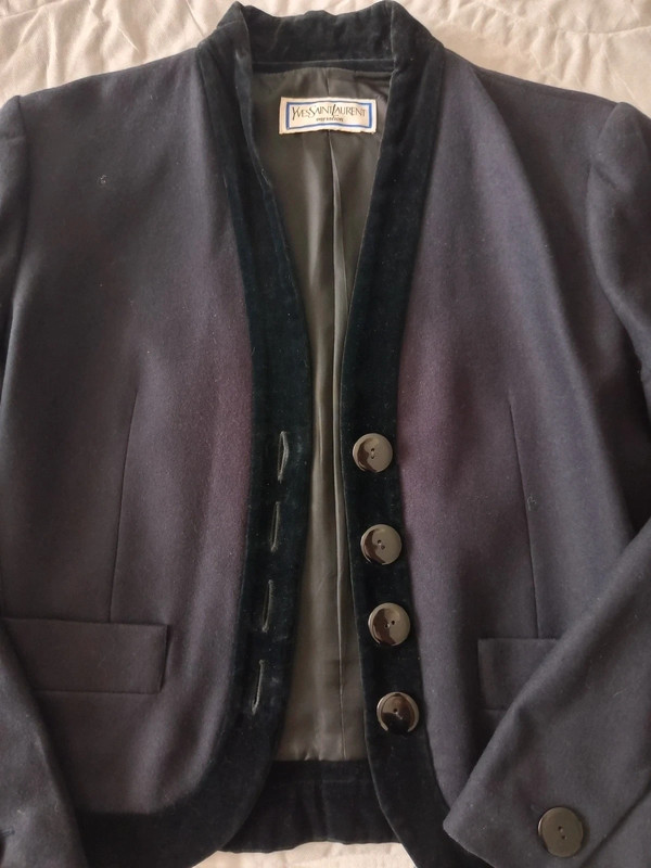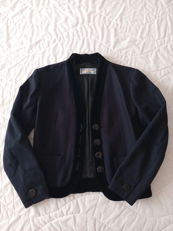 Темно-синя блейзер / куртка з чистої вовни з деталлю з чорного бархату на лацкані та комірі від Yves Saint Laurent з колекції Variations. 90-ті роки. 4 товсті ґудзики спереду та по два на манжетах. Легко приталений. Кишені спереду. У відмінному стані. Розмір 42.