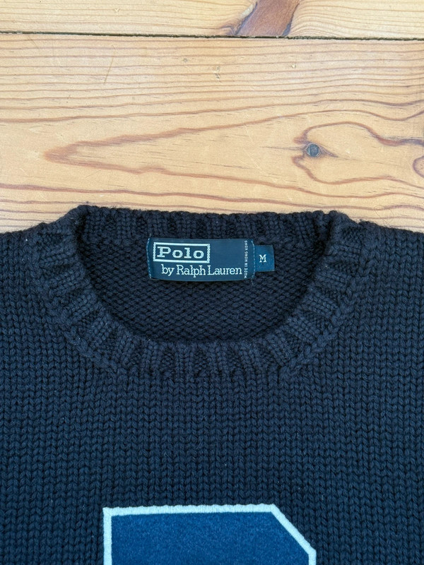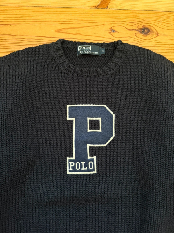 Класичний вінтажний светр Polo Ralph Lauren темно-синього кольору з виразним варситетським логотипом ‘P POLO’ спереду.