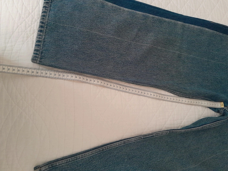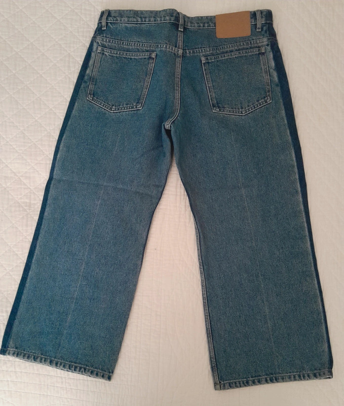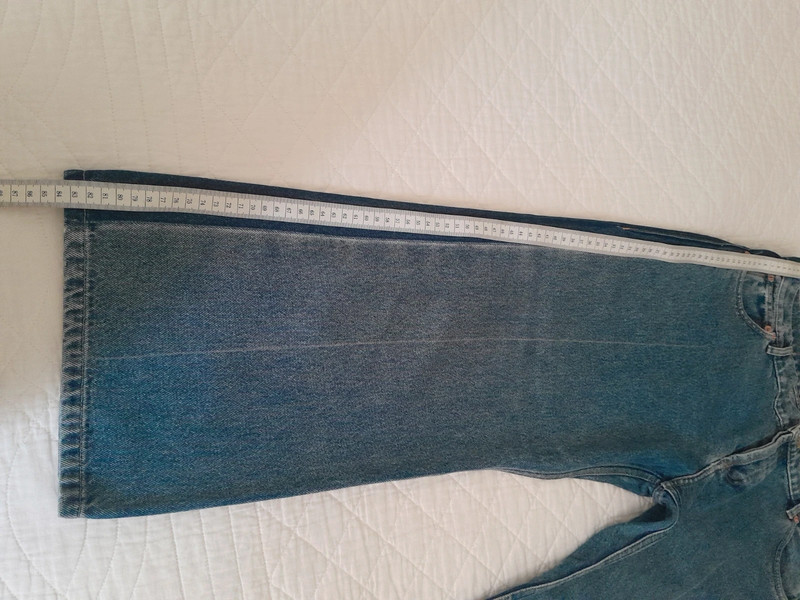 Джинси короткі, з широкою ногавкою.