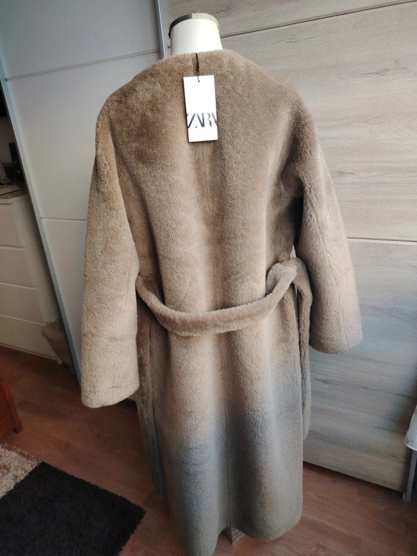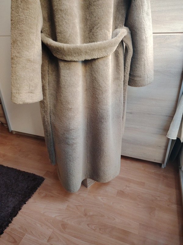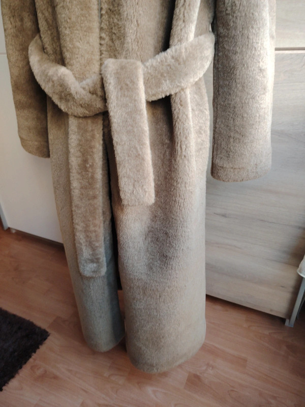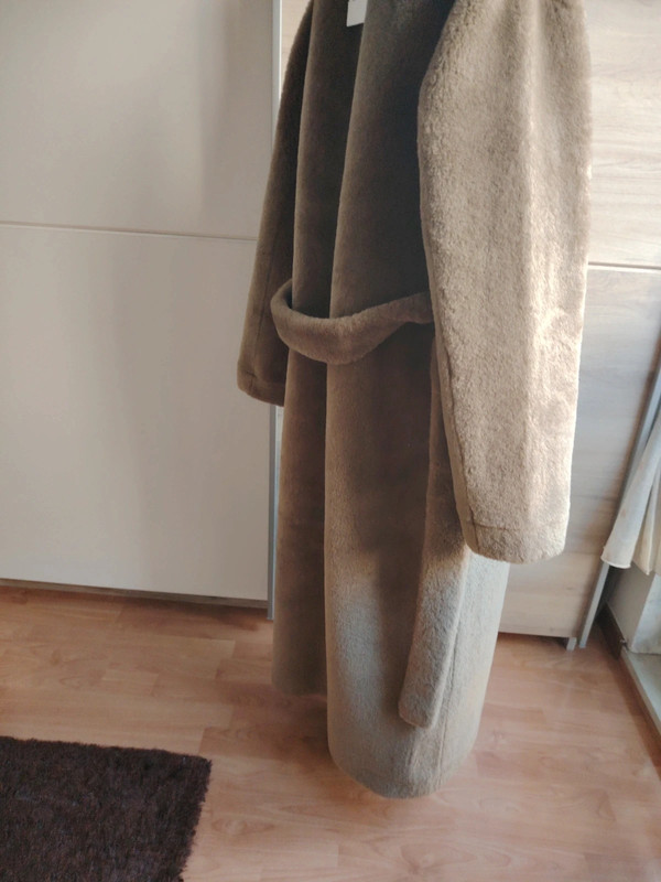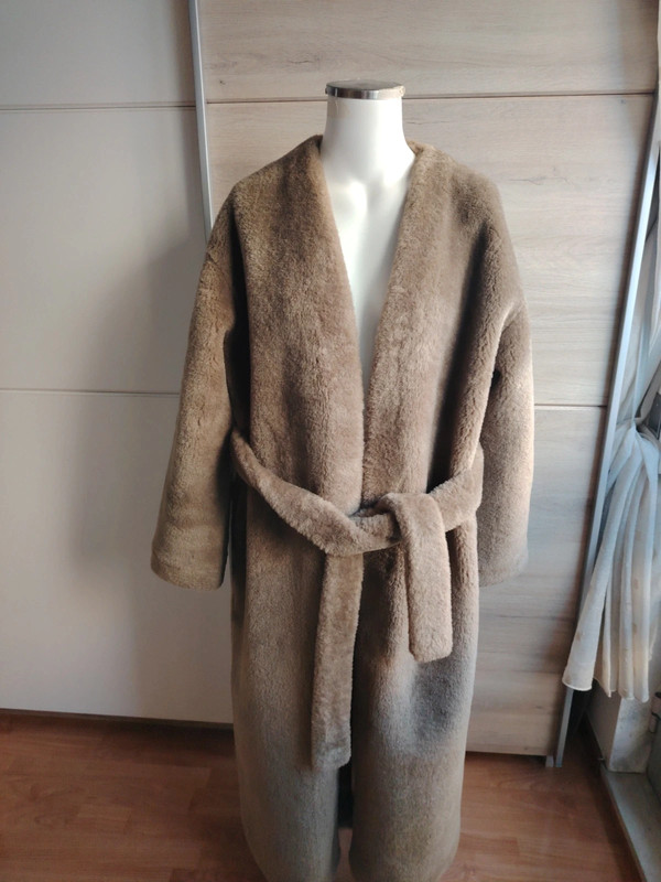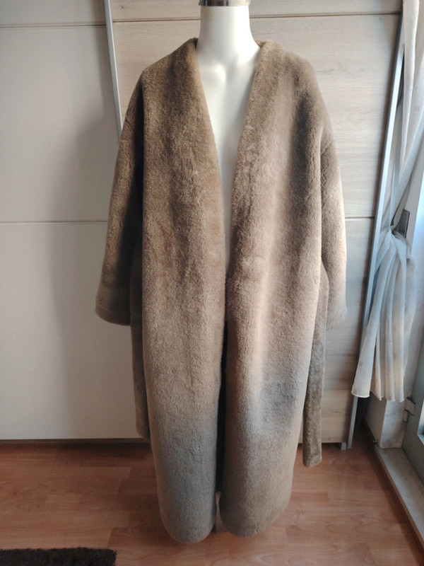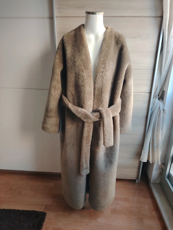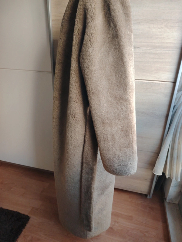 Довгий пальто світло-коричневого кольору зі синтетичного хутра, модель оверсайз, дуже тепле й зручне.