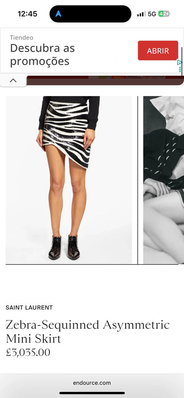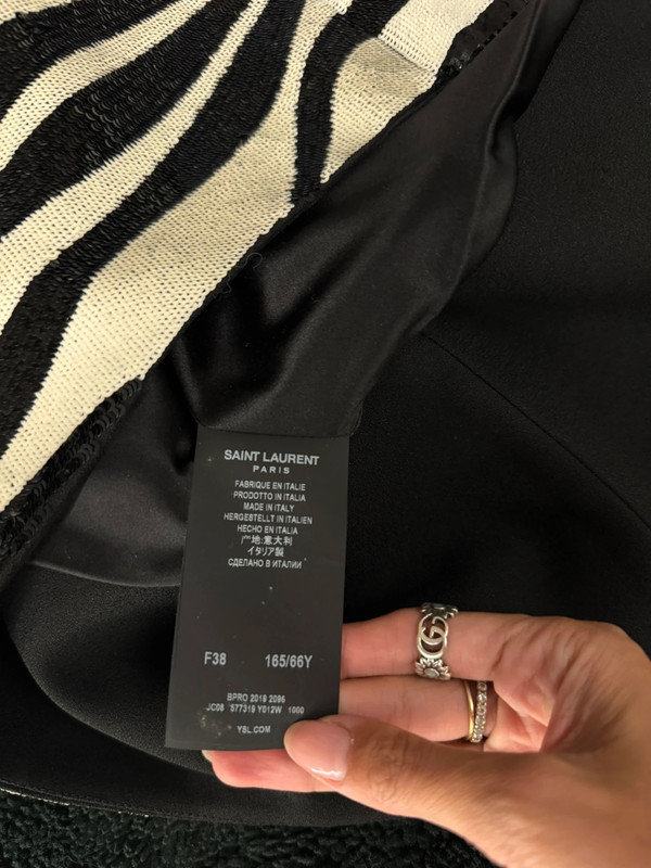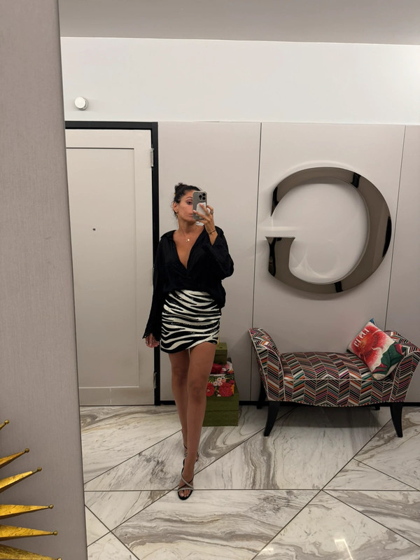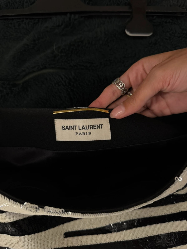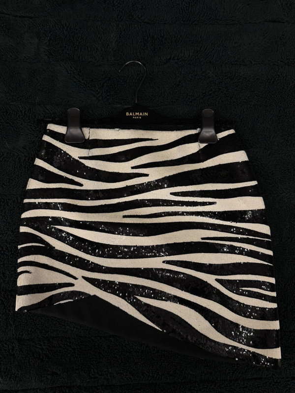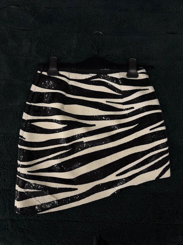 Міні-спідниця від Saint Laurent у чорно-білому кольорі прикрашена блискучими пайєтками у мотиві зебри, що нагадує анімалістичні принти, які можна було побачити на показі колекції AW19. Вона виготовлена в Італії з середньою талією і облягає стегна, закінчуючись асиметричним подолом, а всередині обшита шовковим сатином. Підкресліть сміливий малюнок, поєднуючи її з монохромними речами.