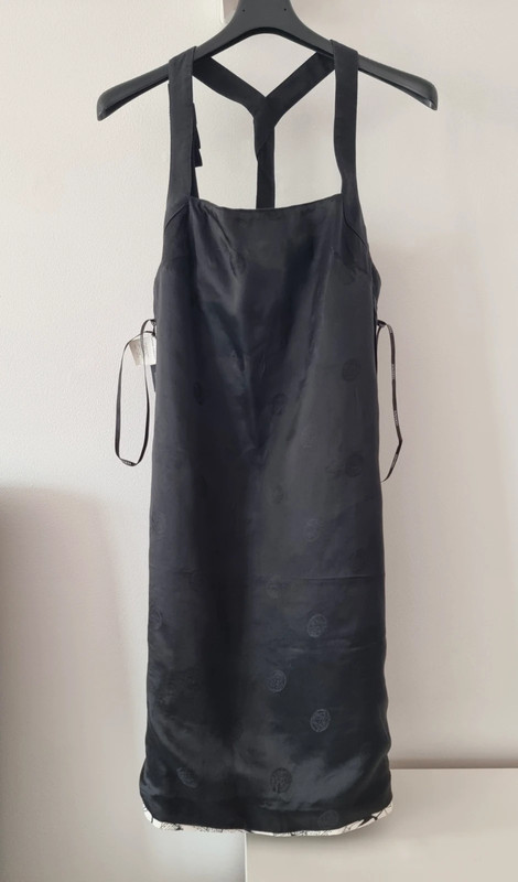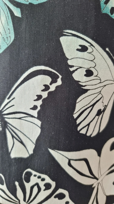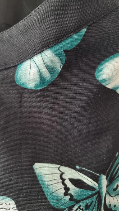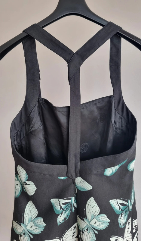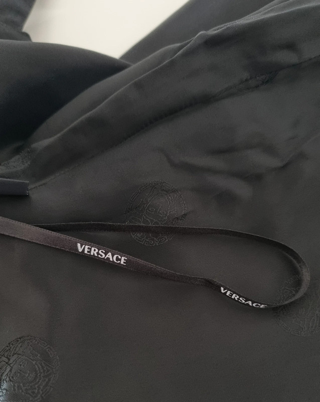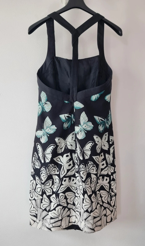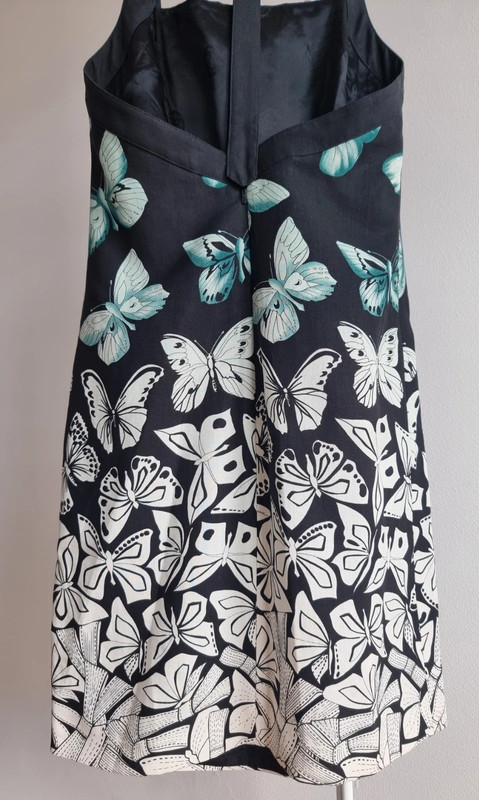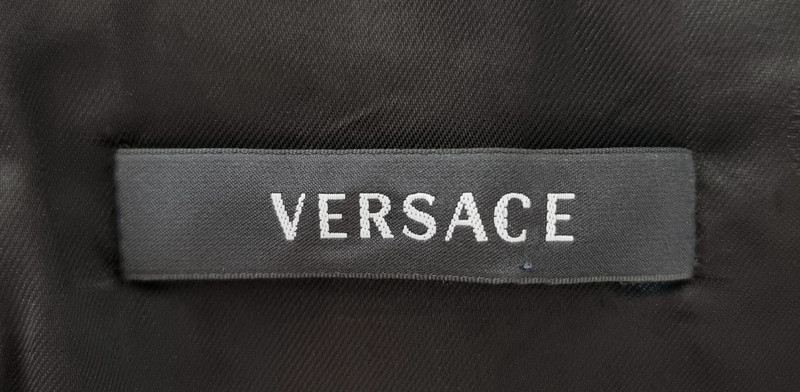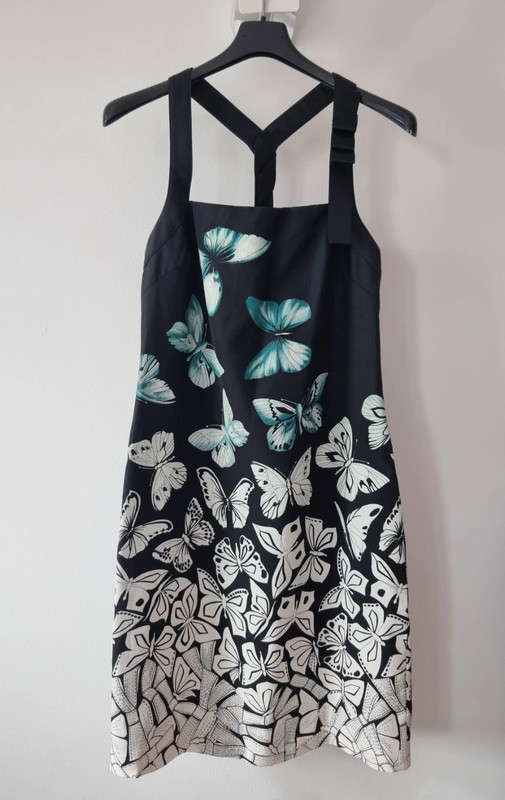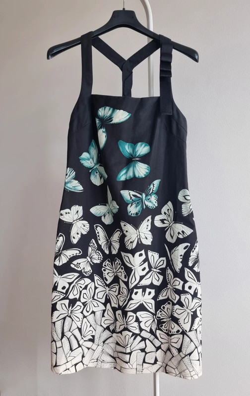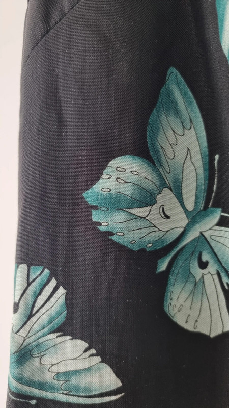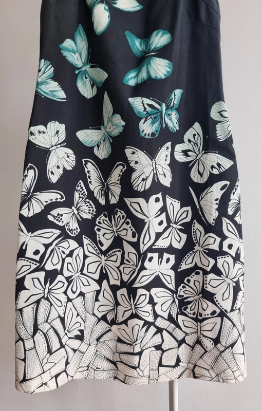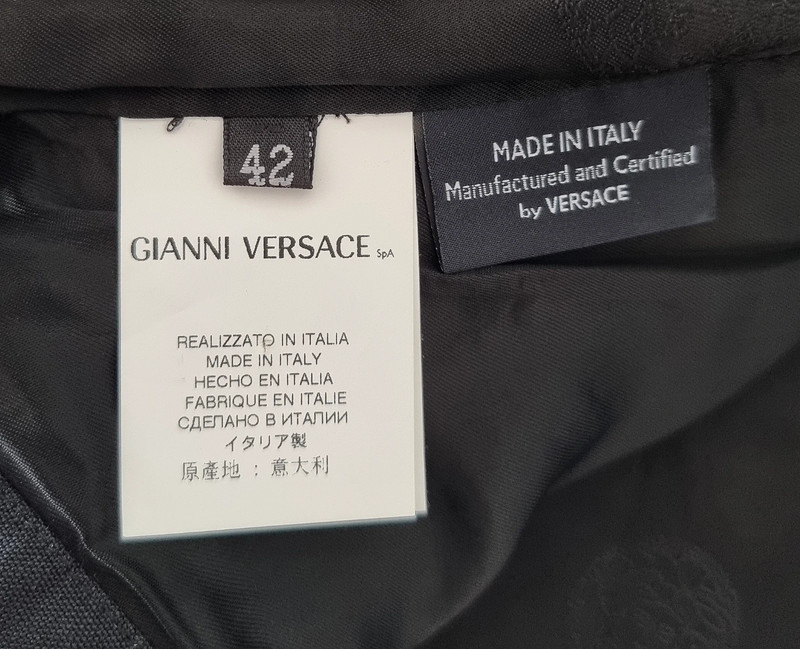 Загалом відмінний стан з трохи катанням на тканині (показано на фото). Рік колекції: 2008 (готова до носіння). Розмір: IT 42. Основна тканина: 94% рамі, 6% шовк. Підкладка: 96% віскоза, 4% еластан. Виготовлено в Італії. Вражаючий друк з метеликами в бірюзовому та слонова кістка на чорному тлі. Рідкісний та елегантний архівний екземпляр, який передає сміливу естетику Версаче зі свіжим, літнім мотивом метеликів.