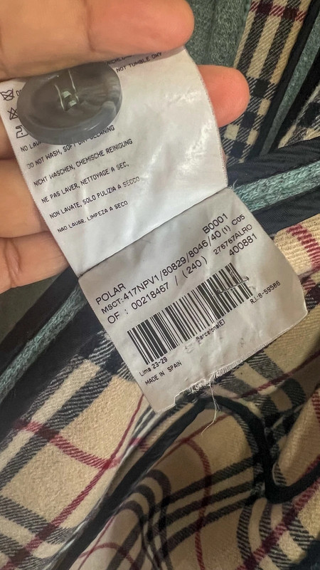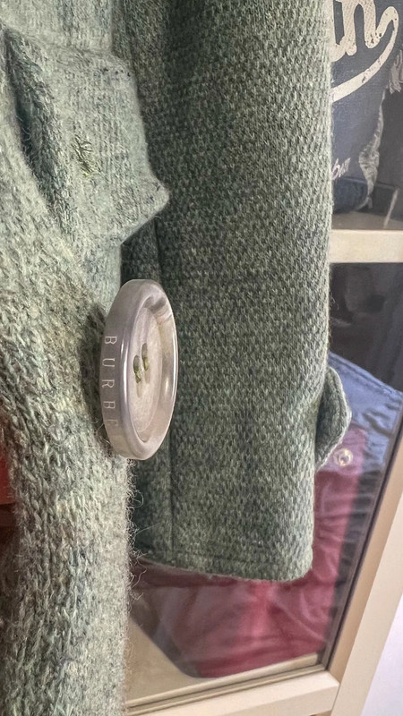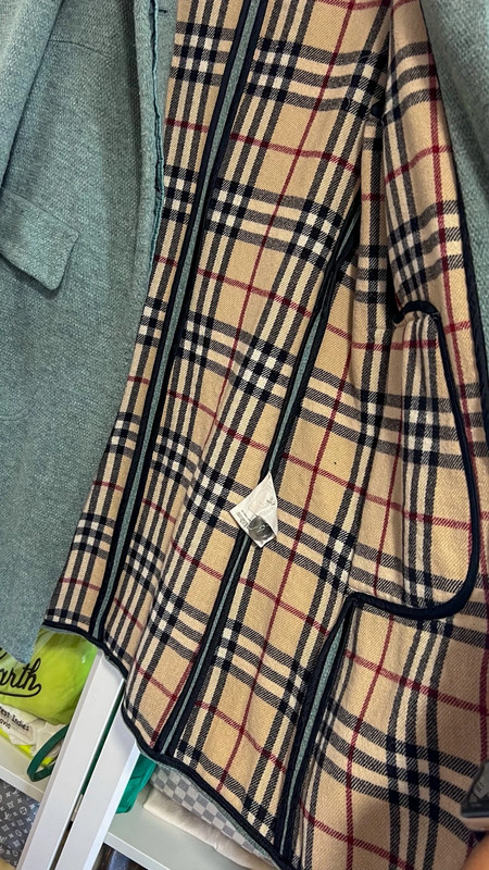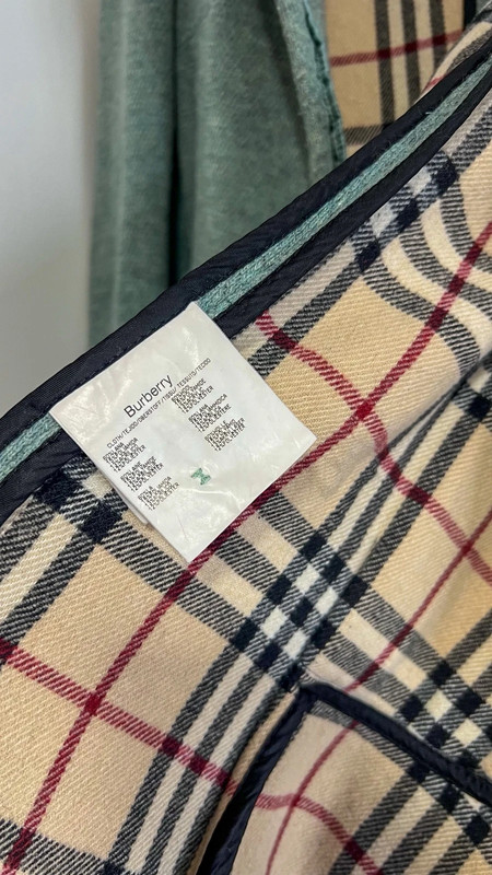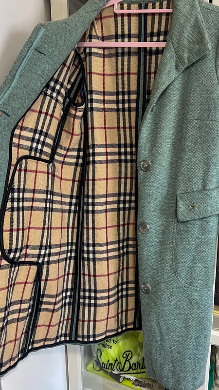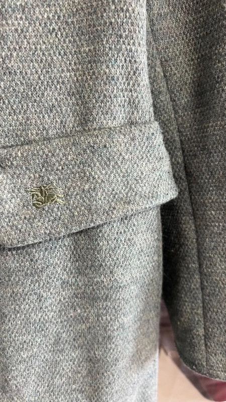 З вовняної тканини, всередині з класичним в клітинку візерунком Burberry, сірі вишиті ґудзики (додається 1 додатковий ґудзик, пришитий до бирки). На бічному кишені вишитий логотип бренду.