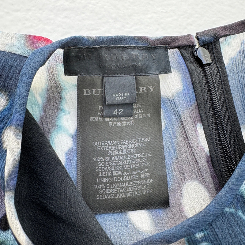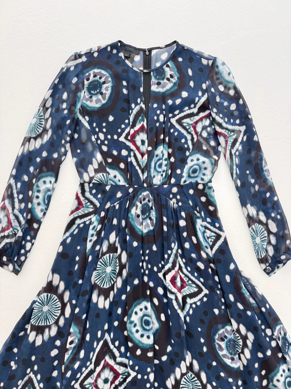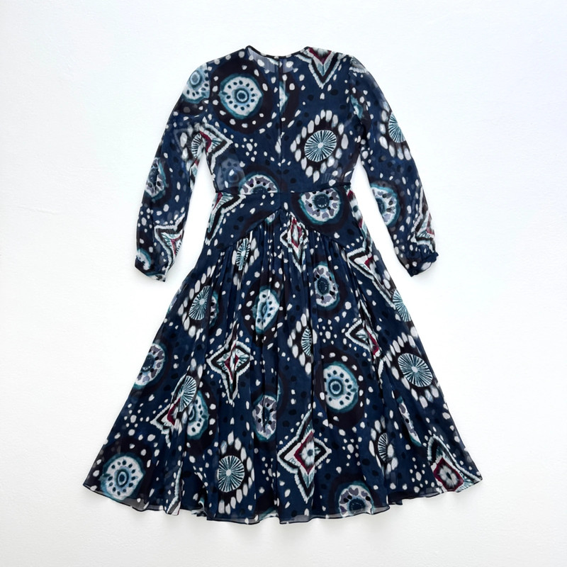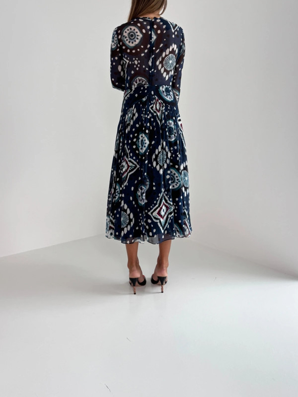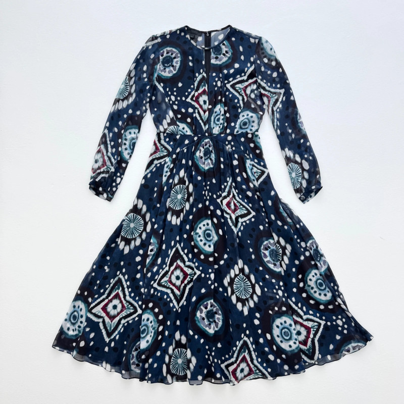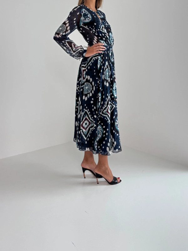 Ніколи не носили сукню-міді з шовку Burberry. Ця елегантна сукня від Burberry – вічний предмет, який поєднує в собі вишуканість і сучасний дизайн. Виготовлена з розкішного легкого шовку, вона має вражаючий геометричний принт у глибоких синіх відтінках з вишуканими контрастними акцентами. Вигідний міді крій створює плавну силует, який чудово рухається, а зібрана талія підкреслює жіночну форму. Довгі рукава з вишуканими деталями та ключовий виріз на горлі додають нотку вишуканої елегантності. Цей дизайн став іконічним після того, як його вдягла Олівія Палермо, серед багатьох інших знаменитостей, що робить його дуже популярним. Ідеально підходить як для денних, так і для вечірніх заходів, ця сукня втілює легку елегантність, за яку відомий Burberry. Приблизні виміри: Плече 38 см, Груди 46 см, Талія 36 см, Довжина 120 см, Рукав 58 см
