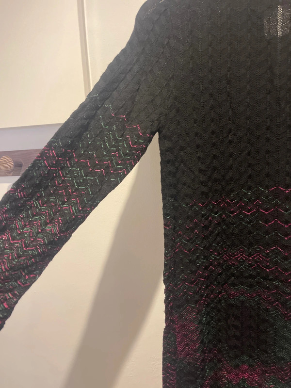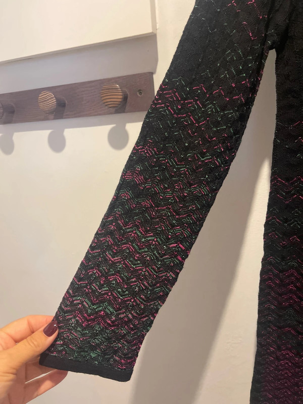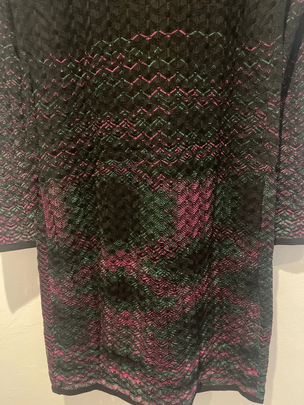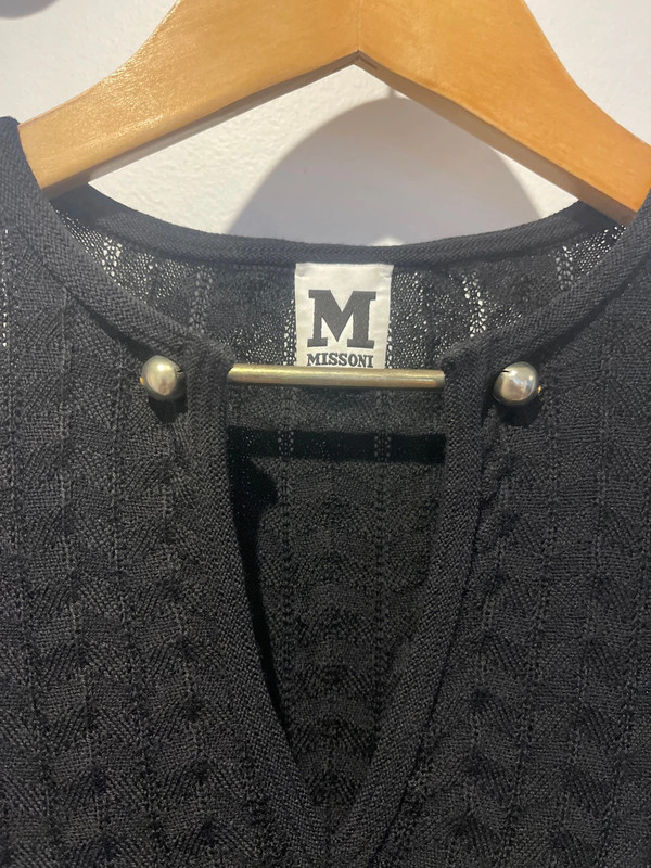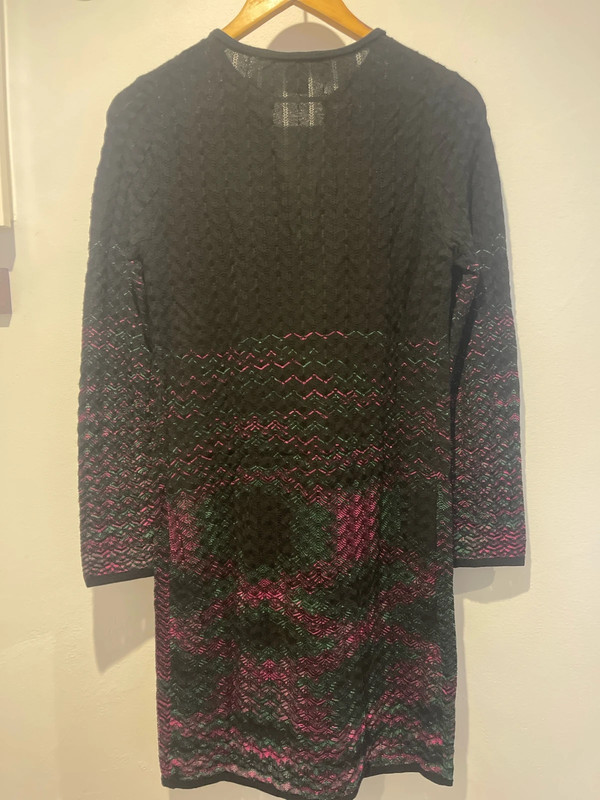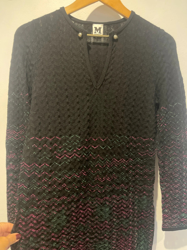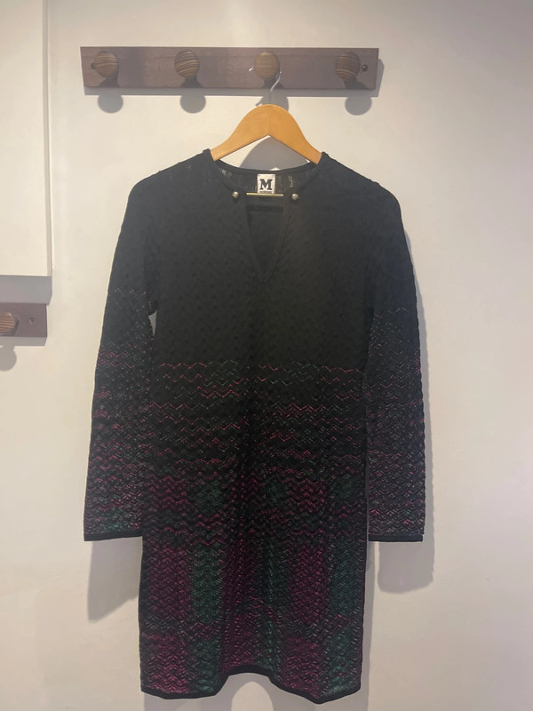 Платье в’язане від Missoni, у дуже хорошому стані. Є металева аплікація в області грудей, кінцевий відріз якої входить і виходить з отвору, схожого на ґудзик. Розмір 42, італійський, що відповідає розміру M в португальському вимірюванні, довжина до коліна.