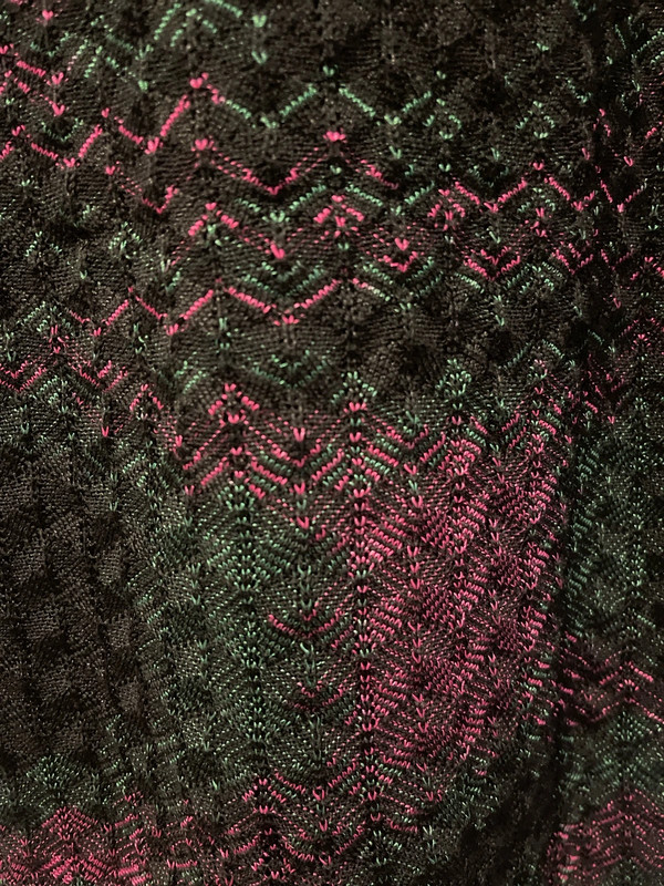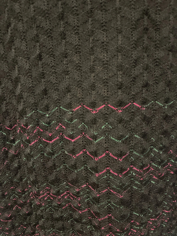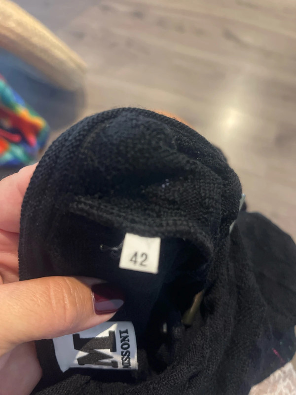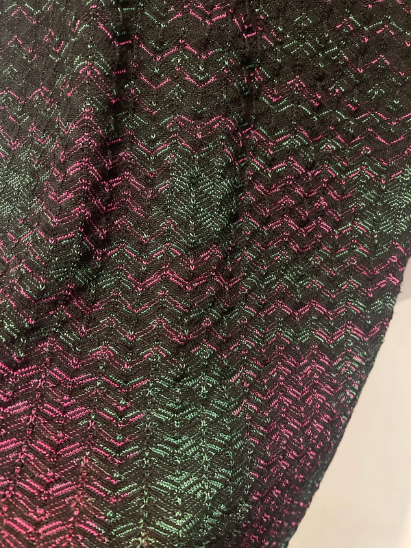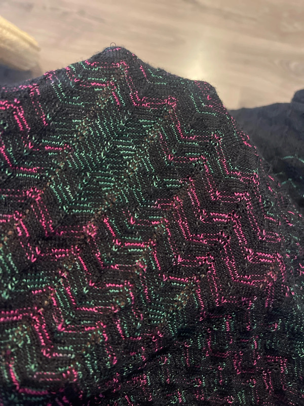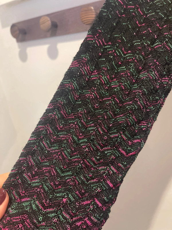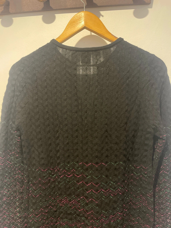 Платье в’язане від Missoni, у дуже хорошому стані. Є металева аплікація в області грудей, кінцевий відріз якої входить і виходить з отвору, схожого на ґудзик. Розмір 42, італійський, що відповідає розміру M в португальському вимірюванні, довжина до коліна.